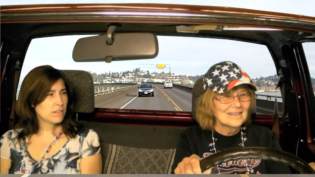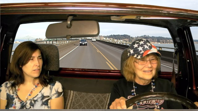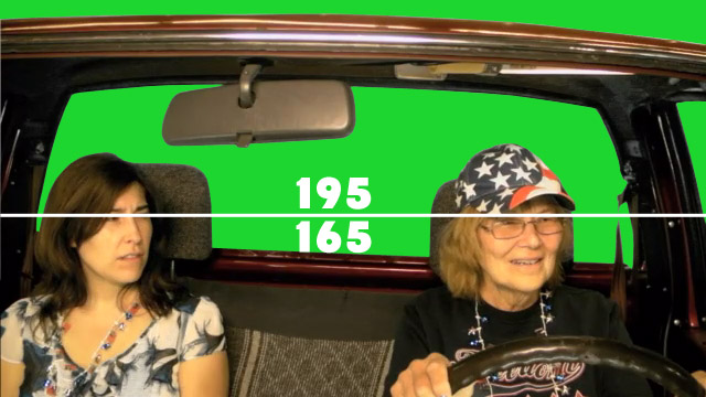 COMPOSITE Here is an image of a scaled version of the scaled and panned video composited with the sample image. The view is much more natural, and the women have return to their normal size, Note also that the eye level of the car behind is approximately the same as theirs. Since they are all seated, presumably with their seats adjusted properly, so everyone's eyes should more or less line up. |