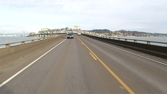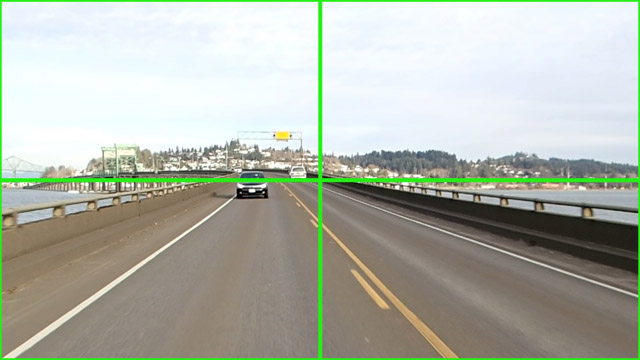 | CONCLUSION In my opinion, the videos should be rescaled with the horizon shifted to the center line of the image. In some cases, we might want to shift the frame right or left as well, especially when there is traffic behind us, to make the location of that traffic more correct. Notice that I did that in the final three images of this discussion, and both our position on the road and the location of the car behind us looks more realistic. I have the capability to do this scaling, panning, and cropping. Click here for a scaled-only version of bay bridge 2. Click here for a scaled and panned version of bay bridge 2, as proposed. Black borders to left and right are a production artifiact that we can get rid of. I will update when I have done so. |