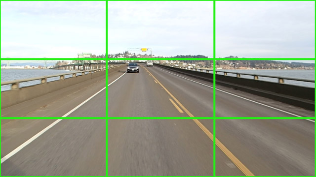 LINE Here is our scaled video with the one third grid overlaid, and we see that your photographer was paying attention in photography class. Not just this frame, but this entire video, and not just this video, but all five of them are composed in this way. |
